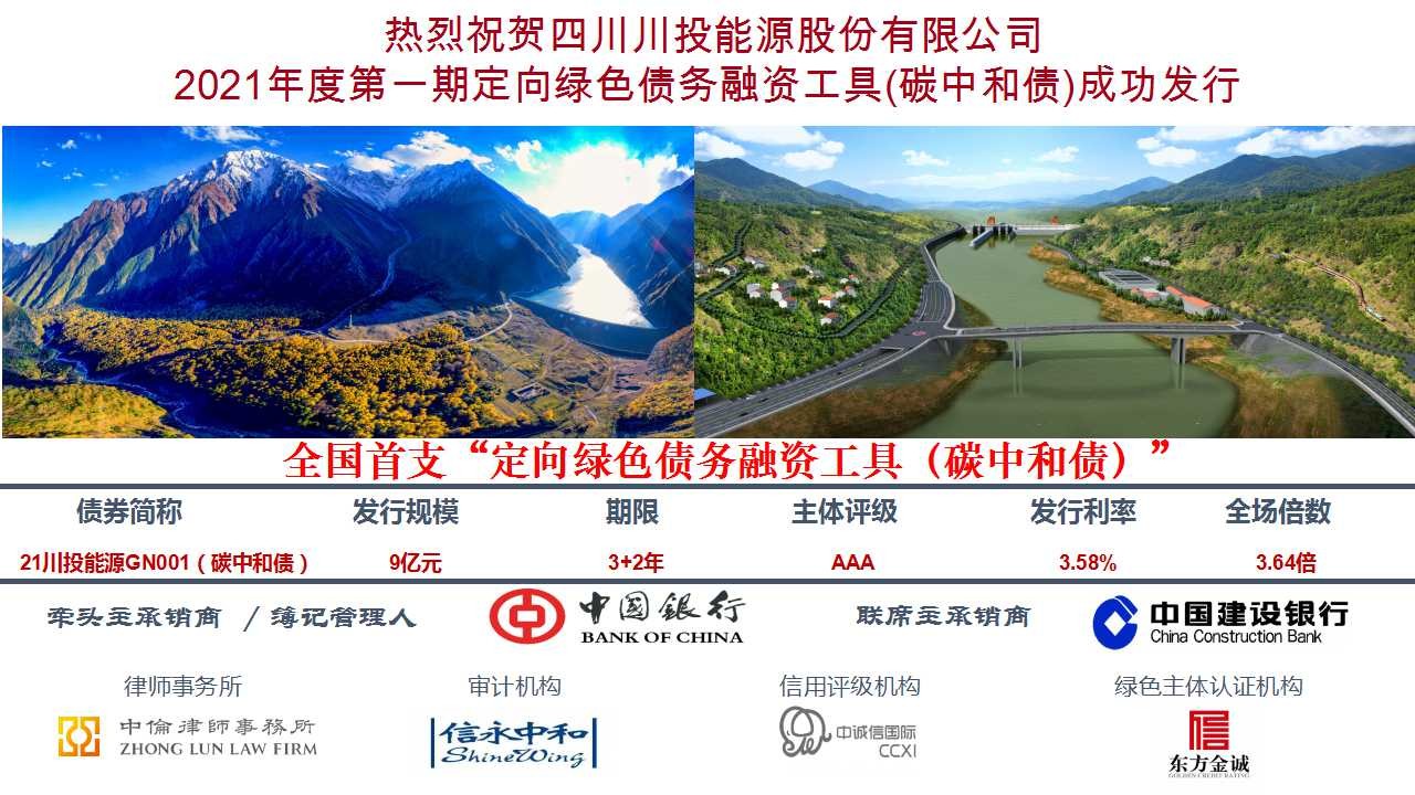 2021Äê7ÔÂ15ÈÕ£¬ÈËÉú¾ÍÊDz©Àֳɿ¯ÐÐ2021Äê¶ÈµÚÒ»ÆÚ¶¨ÏòÂÌɫծÎñÈÚ×ʹ¤¾ß£¨Ì¼ÖкÍÕ®£©£¨¼ò³Æ£º21´¨ÄÜͶGN001£¬´úÂ룺q21071406.IB£©£¬±¾´Î¿¯Ðнð¶î9ÒÚÔª£¬ÏÞÆÚ3+2Äê£¬Æ±ÃæÀûÂÊ3.58%£¬ÊôÏÖÔÚͬÏÞÆÚͬ¶¨ÏòÕ®ÎñÈÚ×ʹ¤¾ßµÄÌìÏÂ×îµÍ¼ÛÇ® ¡£ÕÙļ×ʽð½«×¨ÏîÓÃÓÚÊÕ¹ºÍ¤×Ó¿ÚË®Àû¹¤³ÌÏîÄ¿20%¹ÉȨ ¡£